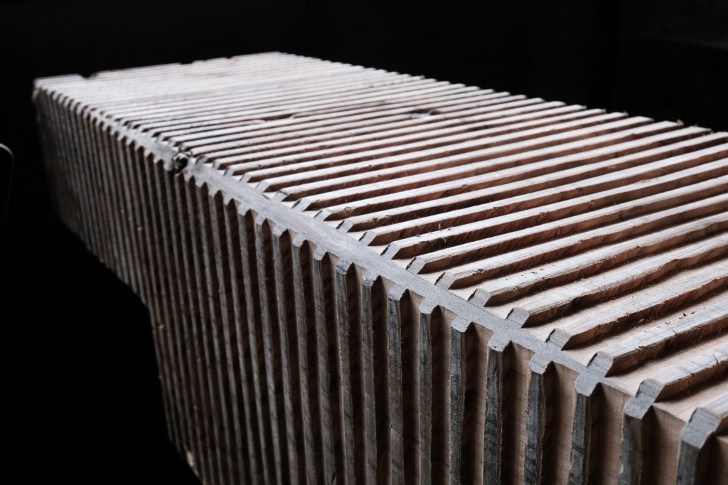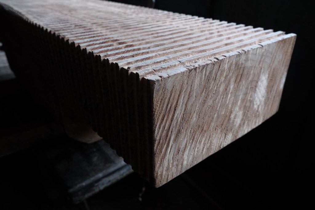 Riccardo has carved out the ‘panchetta’ bench form from a cedar tree trunk. He has then bevelled linear grooves out of the timber, creating a dynamic textural pattern. On each end of the bench he has left the beautiful natural textures apparent from the making process. A stunning and bold piece for once home this would work well as a coffee table or side bench in a hallway. Any movements, cracks and changes in the appearance of the wood are intrinsic characteristics of these items and result from the natural settlement and diverse environmental conditions of the wood.